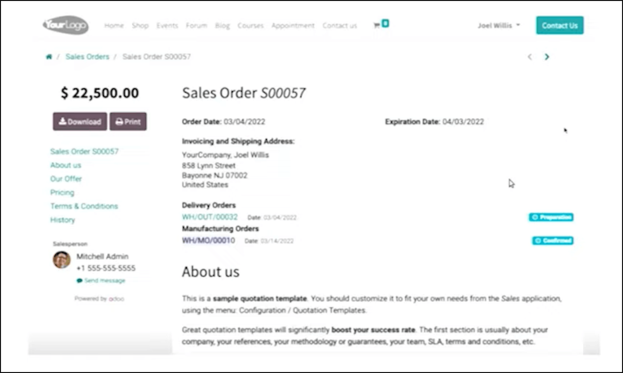 Hệ thống Odoo mới còn giúp người dùng phân tách hoặc hợp nhất các đơn hàng sản xuất. Hiển thị tình trạng đơn hàng sản xuất trong tài khoản của khách hàng.
