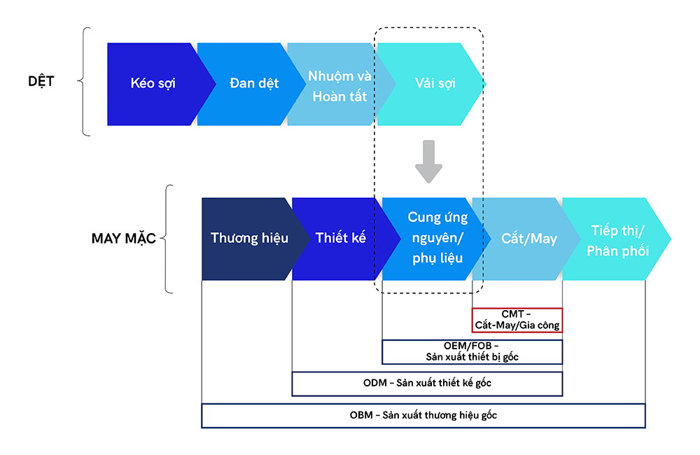 Mô tả giá trị gia tăng của các khâu trong chuỗi giá trị ngành dệt. Ngành dệt Việt Nam đang ở chuỗi giá trị ít giá trị nhất.
