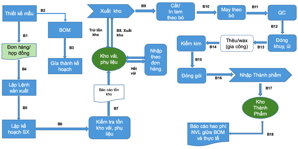 - Kho theo lệnh sản xuất để xuất nguyên liệu theo thứ tự trước sau các loại nguyên liệu cho cùng sản phẩm (vải, chỉ, khuy, nút, logo,…).