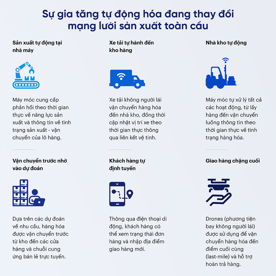 Tại các doanh nghiệp hàng tiêu dùng, robot có khả năng thực hiện công việc quản lý kho hàng từ nhập, xuất, đóng gói và vận chuyển. Thêm nữa, xe tải tự lái vận chuyển sản phẩm đến mạng lưới chuỗi cung ứng. Trong tương lai, máy móc có thể thay thế phần lớn công việc hiện nay đang được đảm nhận bởi con người để gia tăng hiệu suất xử lý công việc.